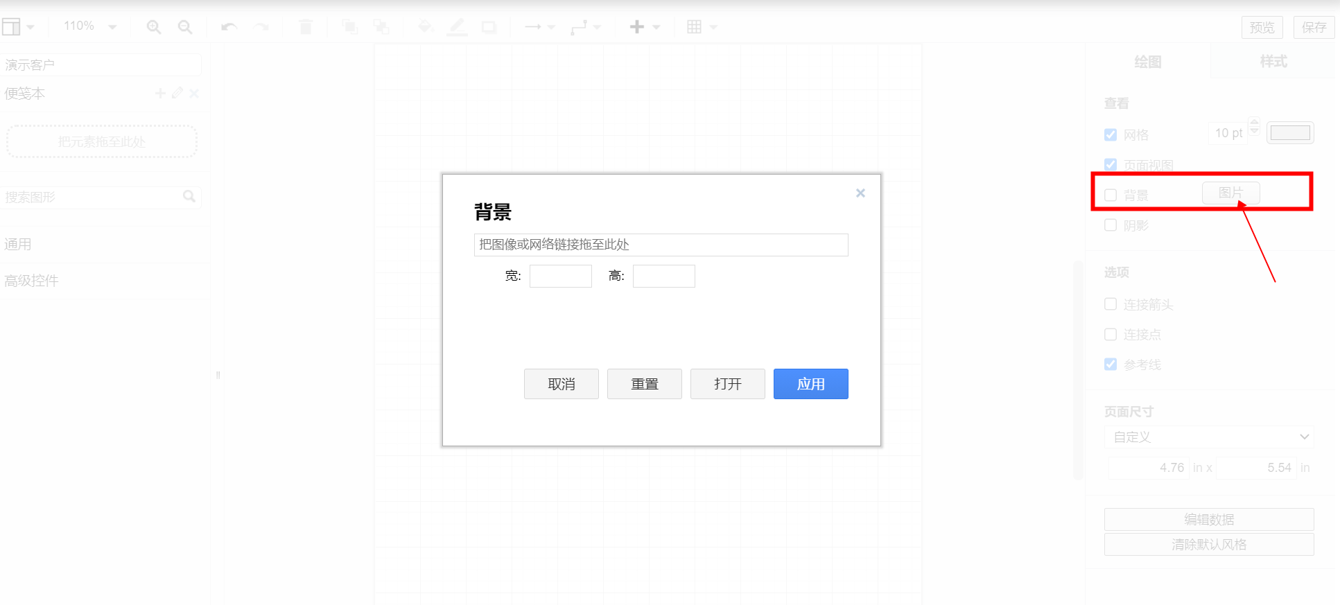 - 右侧属性栏里点击背景"图片"可上传背景图,背景图默认铺满整个画布