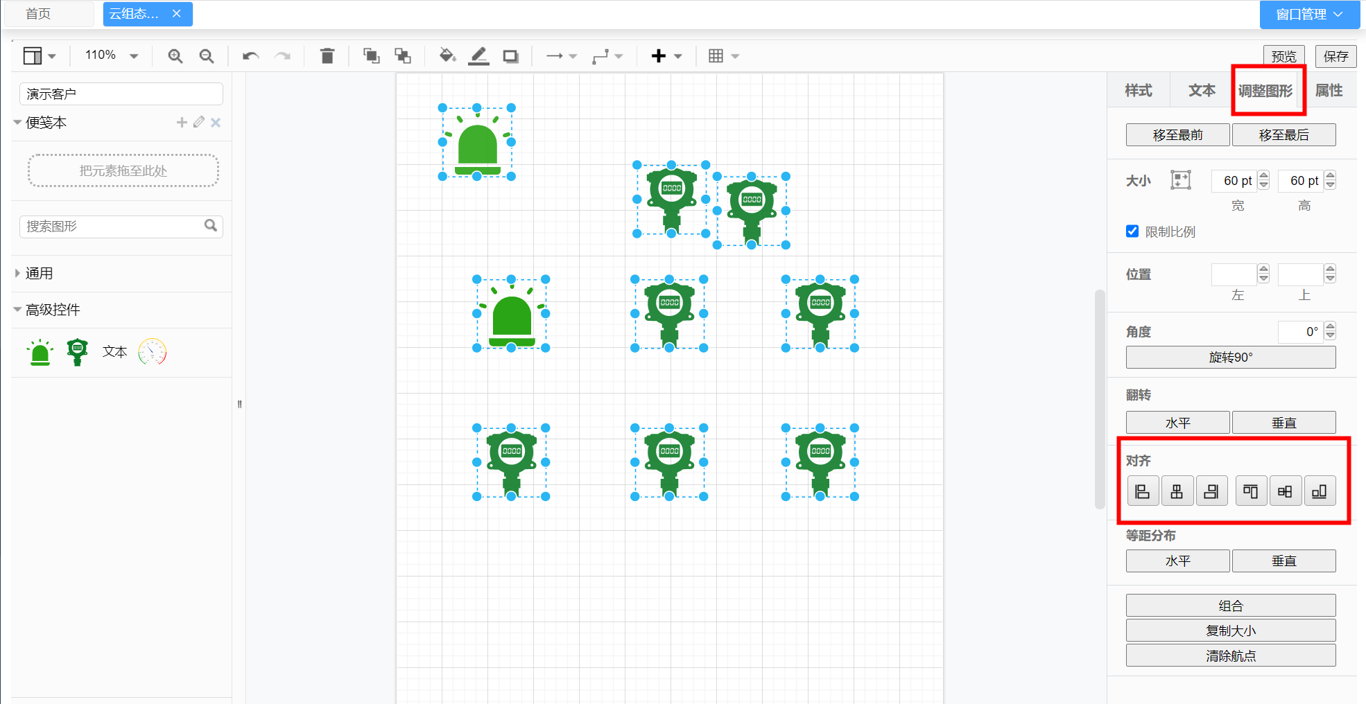 - 当要对齐多个元素时,选择多个元素(可通过ctrl+鼠标左键选择多个目标或者按住鼠标左键框选),然后在右侧面板“调整图形”中选择你想要的对齐方式或分布方式。