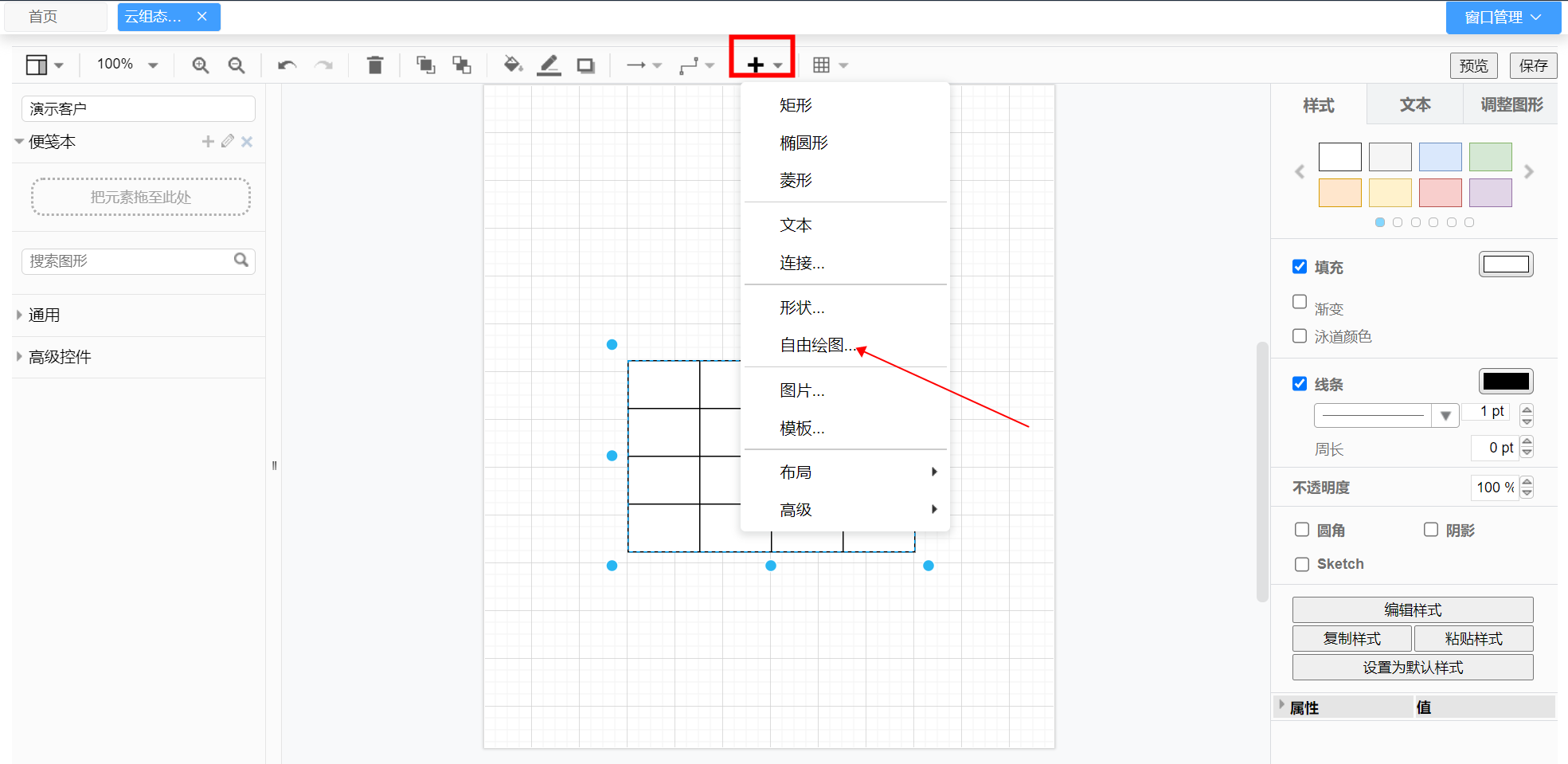 - 有时一些特殊的图案软件中并没有提供,这时可以使用自由绘图功能自己去绘制。点击上方的加号,再点击自由绘图,会弹出一个自由绘图窗口。点击开始绘图按钮就可以自己用鼠标随便绘制,绘制完后点击结束绘图按钮,刚刚绘制好的图案就会变成一个元素随意使用。