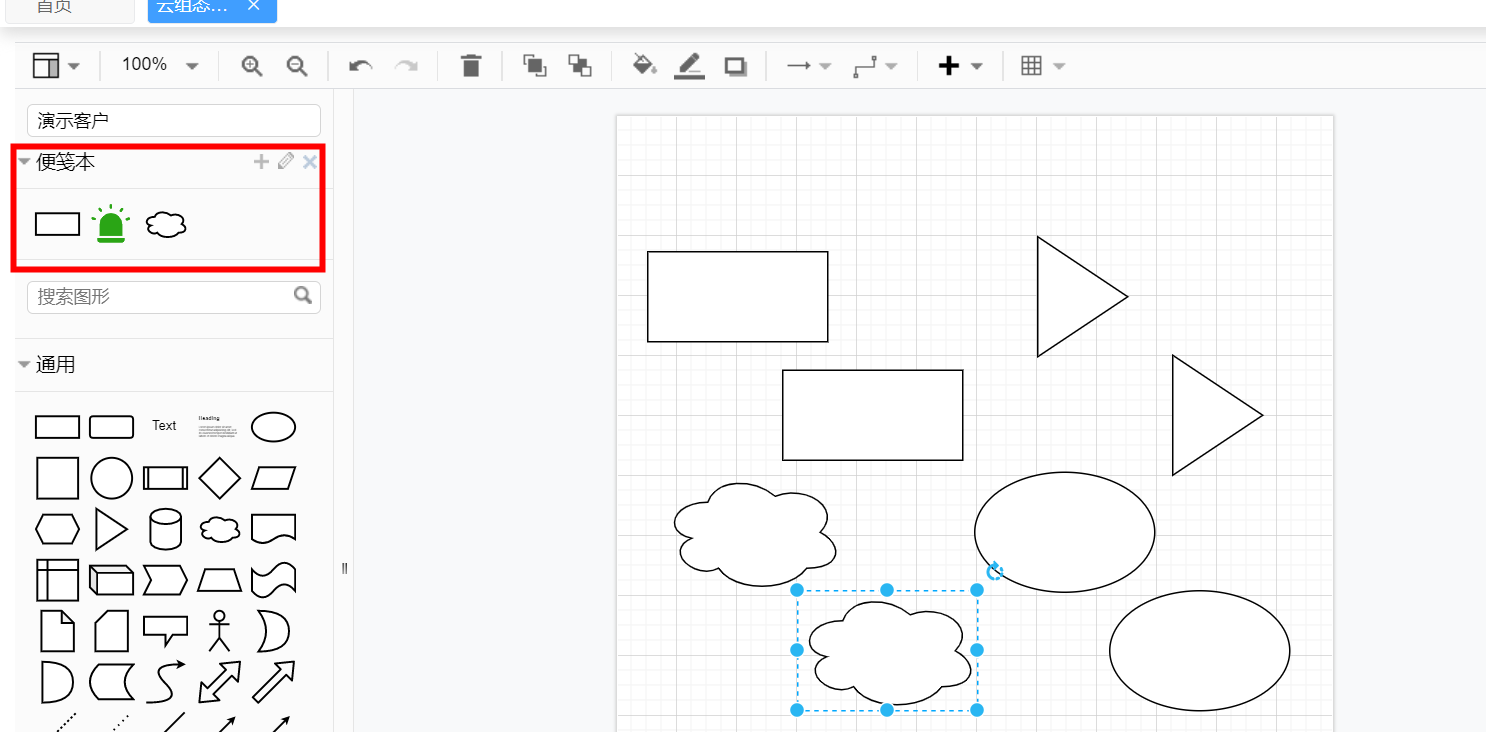- 有时一些元素(可能是你自己组合设计的新元素)经常被用到,我们可以将其保存成一个模板方便下次使用。如下图所示,将需要保存的元素用鼠标拖至左侧的“便筏本”中,这样以后都可以直接使用。