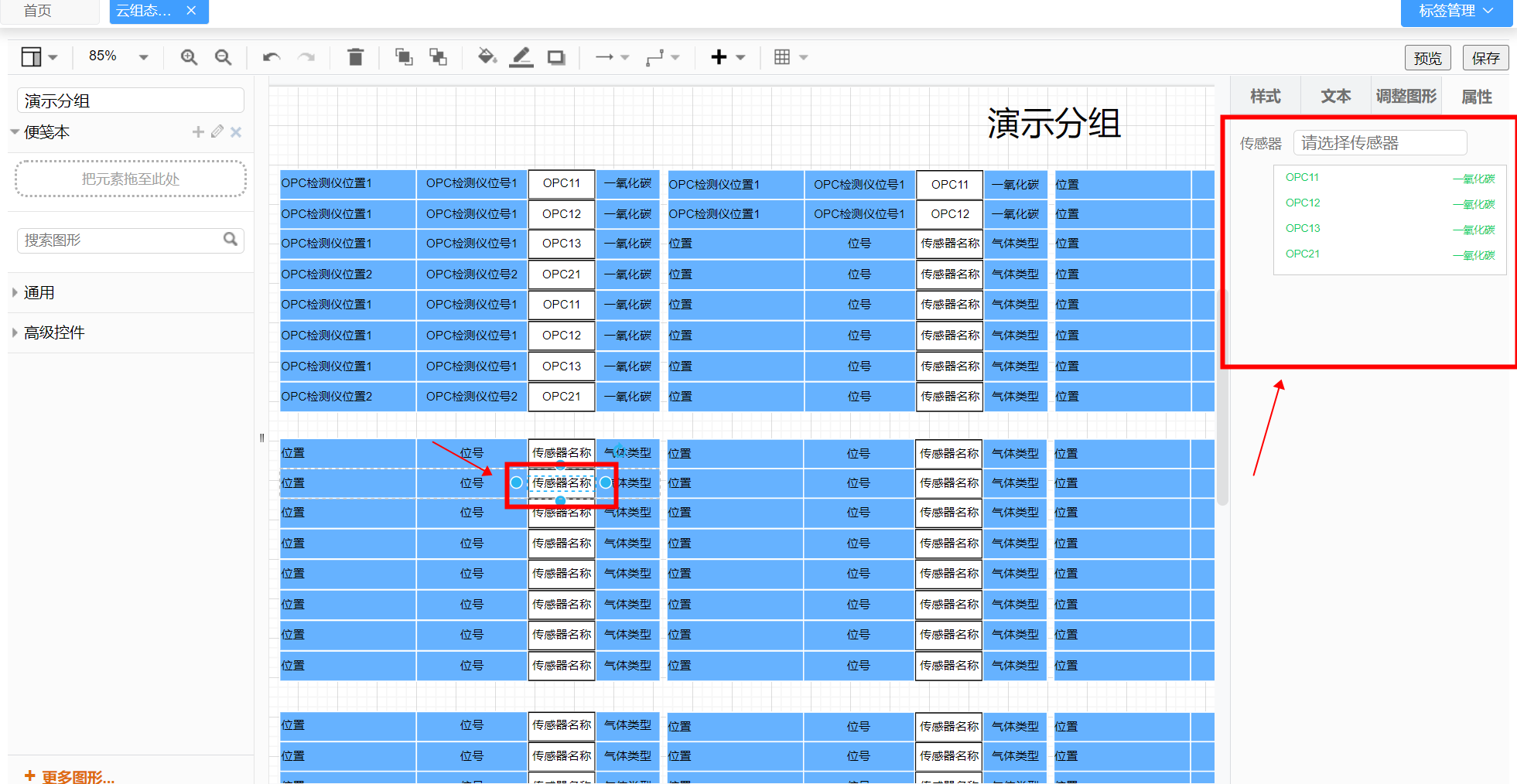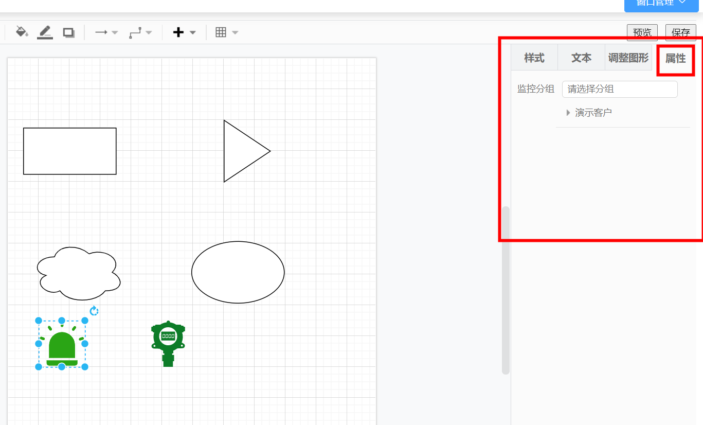 - 7、在右侧面板的“属性”中可以根据元素类型绑定监控分组/检测仪/传感器