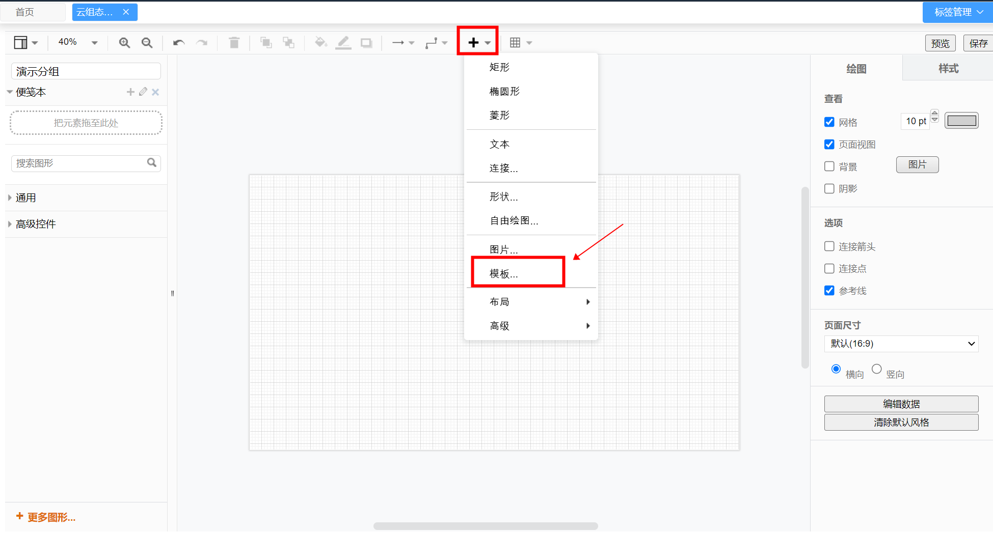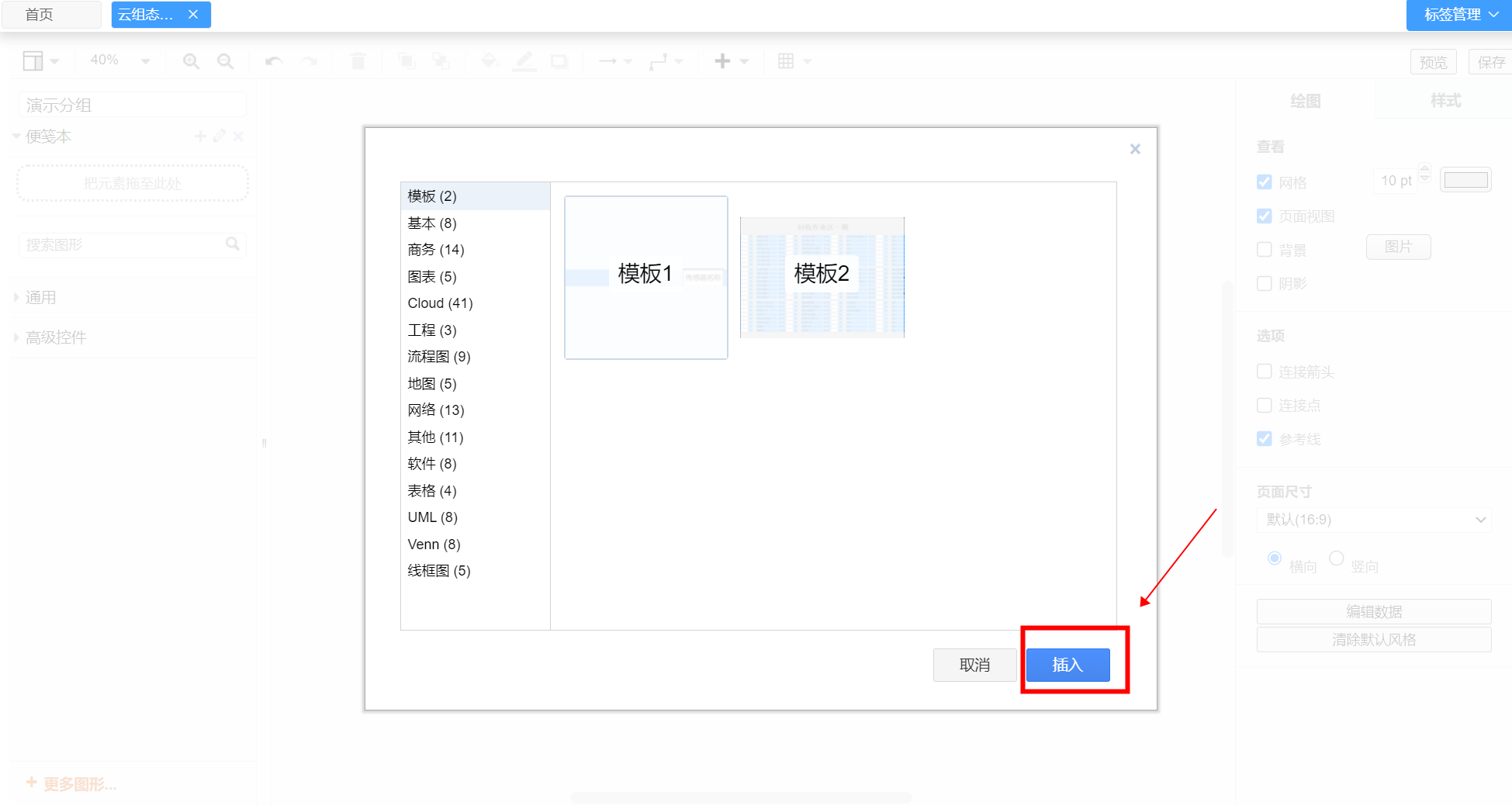 - 点击上方工具栏的加号,再点击“模板”,选择合适的模板后点“插入”