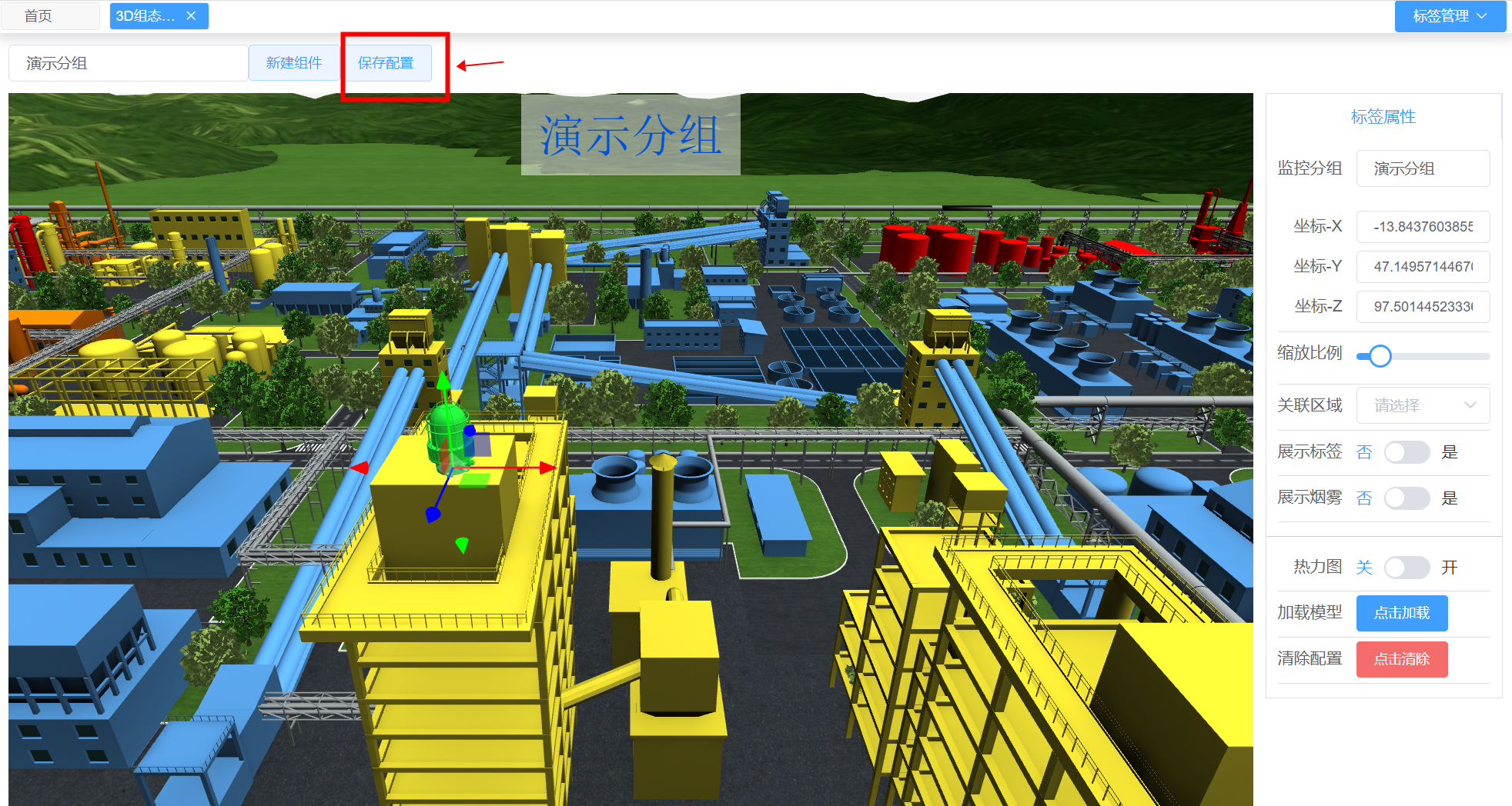 - 当右边的标签属性配置完成后,组件颜色变为绿色,提示用户该组件已配置完成。配置完成后,点击上方”保存配置”后即可完成3D组态配置。