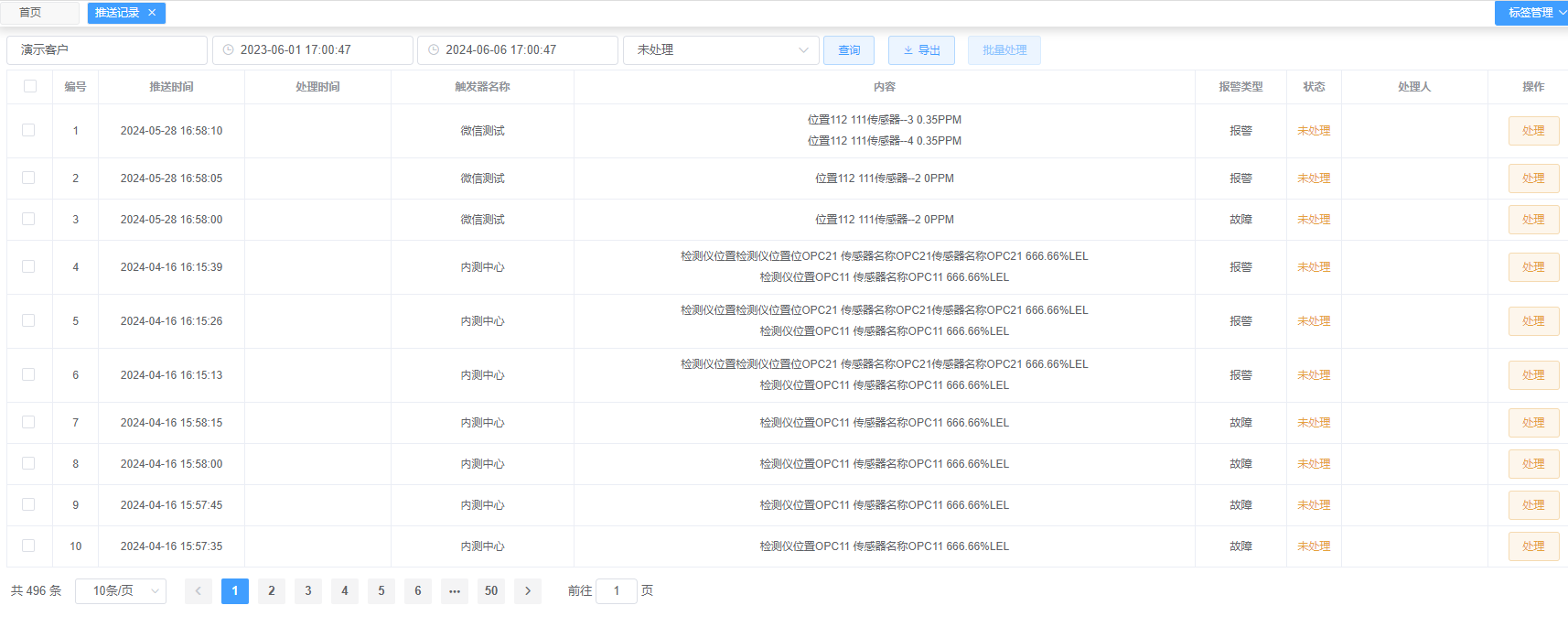 信息包括推送时间、处理时间、触发器名称、内容、报警类型、处理状态、处理人等。