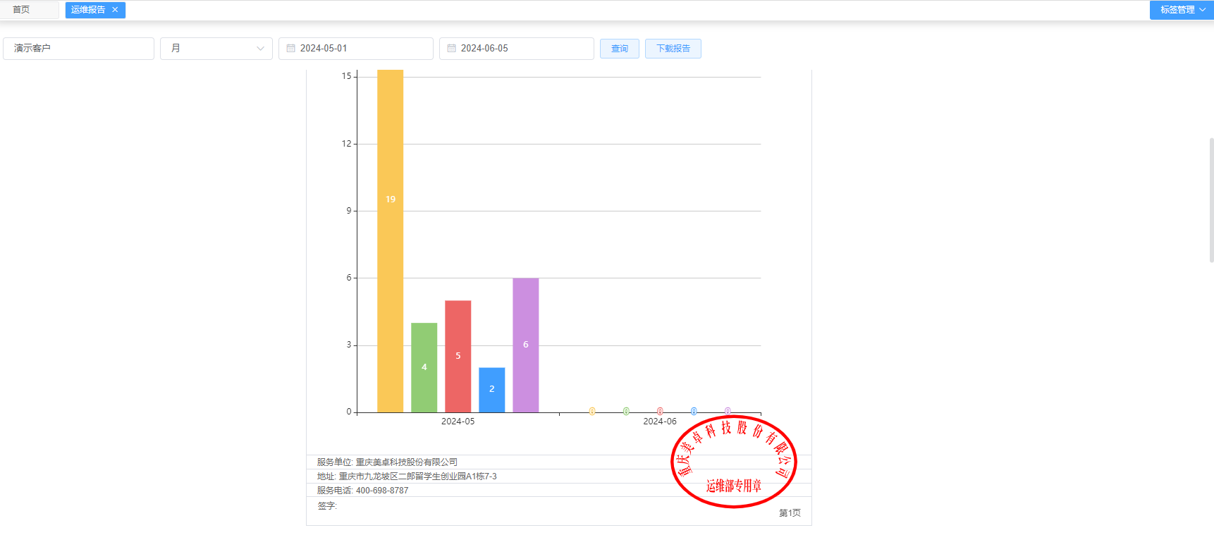 必须选择分组后才能查看,时间默认为本月1号至当前日期 统计类型有天/周/月,默认按天统计 报告信息包括:巡检比对次数、维修次数、标定次数、更换次数以及运维明细