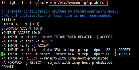 [root@localhost ~]# vim /etc/sysconfig/iptables
