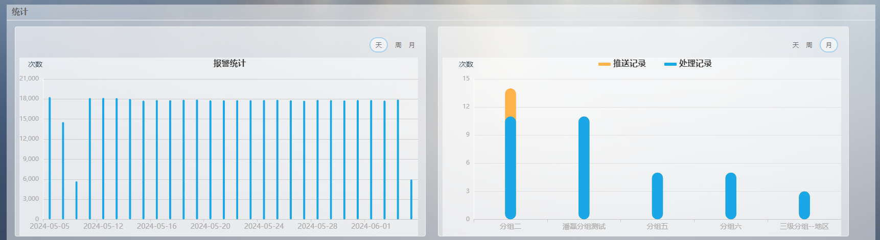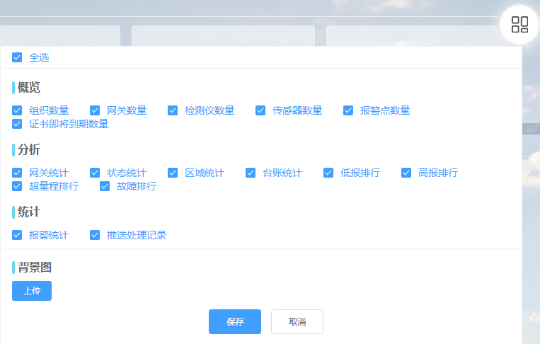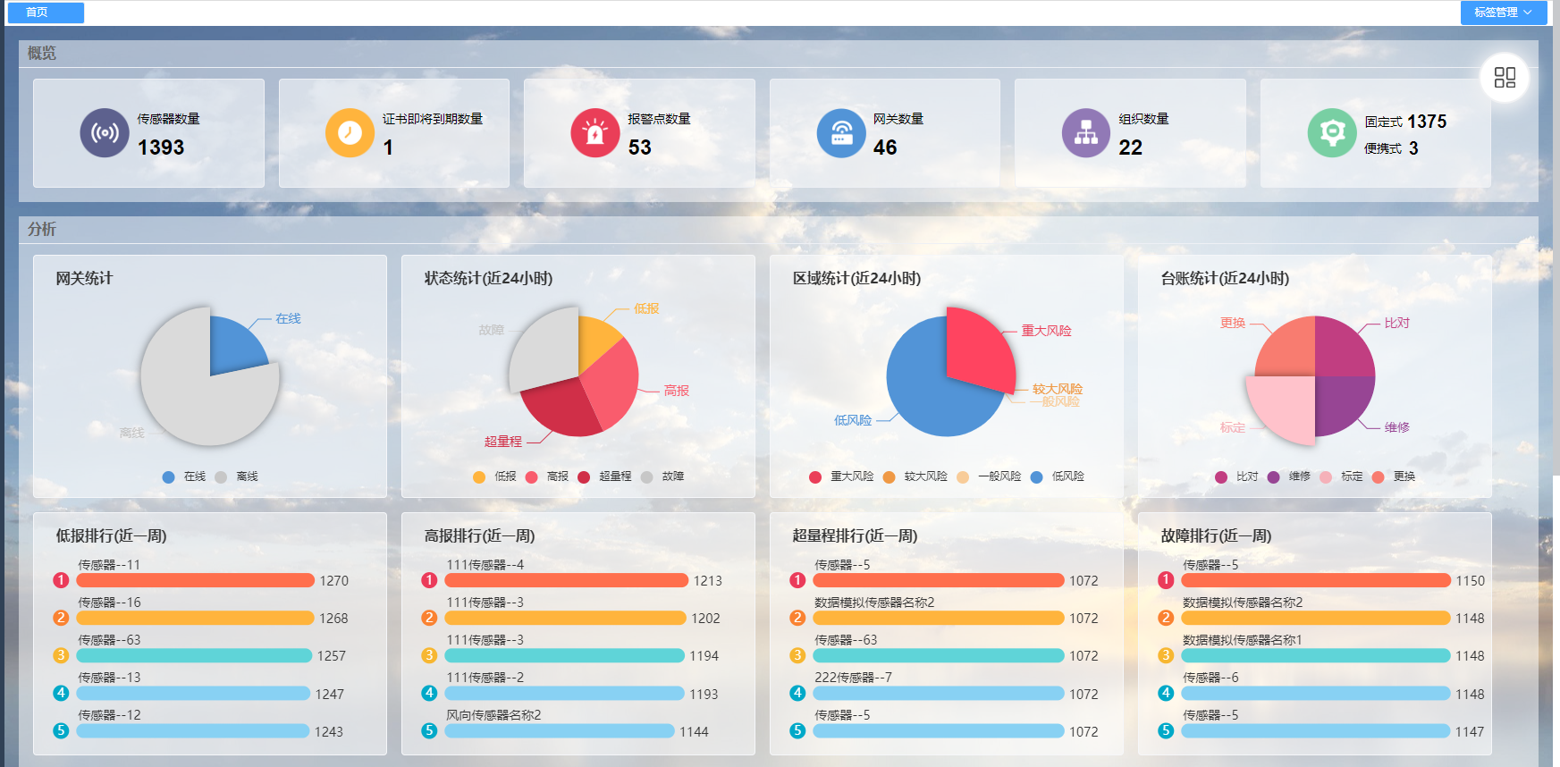 概览:组织数量、网关数量、检测仪数量、传感器数量、报警点数量、证书即将到期数量