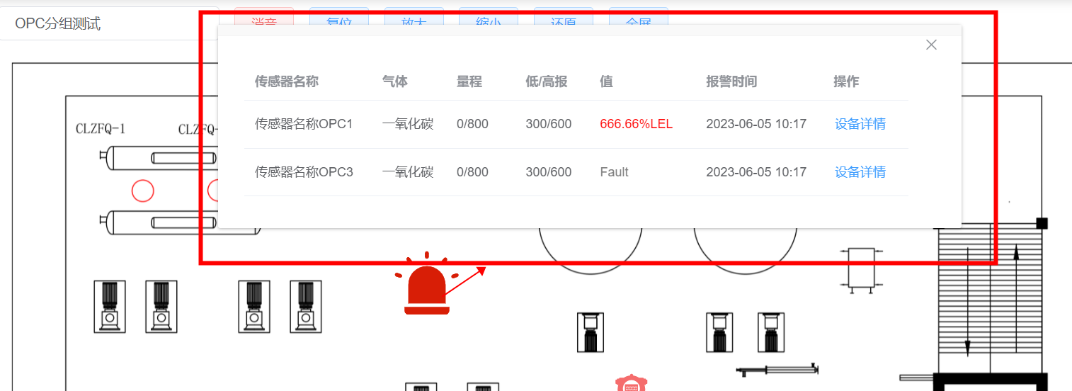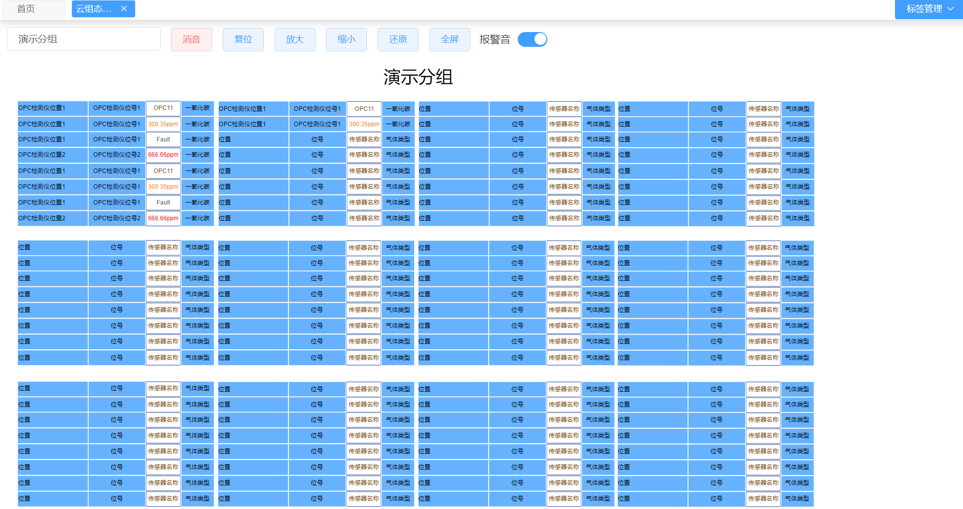 - 图中如果有绑定分组/检测仪/传感器的标签将通过对应实时报警信息显示对应的颜色或实时值