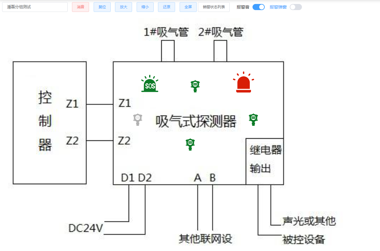 - 图中如果有绑定分组/检测仪/传感器的标签将通过对应实时报警信息显示对应的颜色或实时值