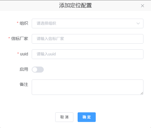 选择组织(必填) 信标厂家(必填) uuid(必填) 启用(开关按钮) 备注信息