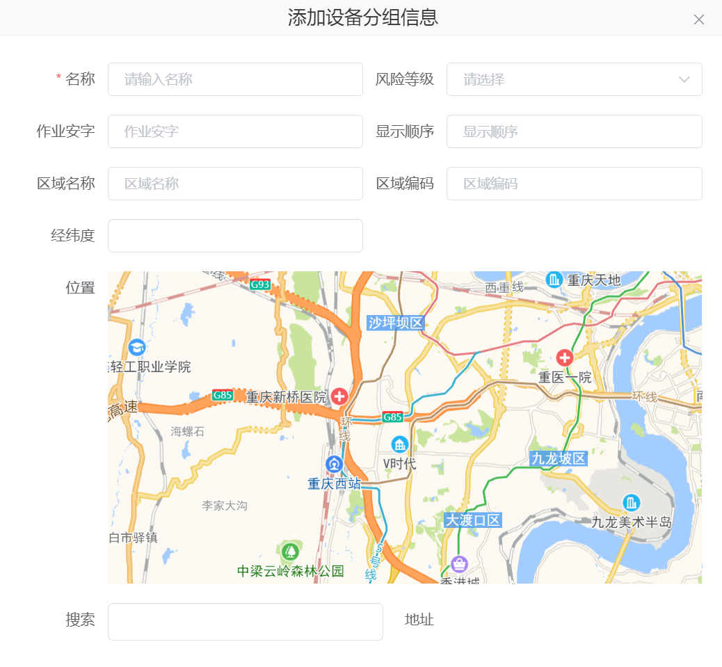 名称 必填项 分组的名称 位置 可在模糊查询中搜索地图位置 经纬度 非必填项 当前分组的经纬度